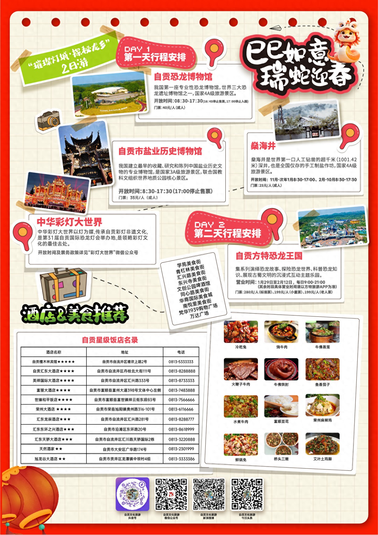 第一天,游客可以前往自贡恐龙博物馆——我国第一座专业恐龙博物馆,世界三大恐龙遗址博物馆之一,国家4A级旅游景区。春节期间,博物馆将举办昆虫主题展览、恐龙版画拓印体验活动以及探秘恐龙世界主题活动,让游客亲手触摸历史纹理,感受恐龙文化的独特魅力。随后,游客可以前往燊海井——世界第一口人工钻凿的超千米深井,也是全国仅存的手工制盐作坊,国家4A级旅游景区。大年初一,燊海井将为前10组游客送上福袋礼包。接着,游客可以参观自贡市盐业历史博物馆——中国唯一的井盐史专业博物馆,国家一级博物馆,国家AAA级旅游景区。春节期间,博物馆将举办非遗手工体验课堂、非遗展示博览会活动,还有舞龙舞狮、川剧、杂技、曲艺等精彩演出。最后,游客可以前往中华彩灯大世界——国家4A级旅游景区、国家级夜间文化和旅游消费集聚区,领略彩灯文化的独特魅力。
